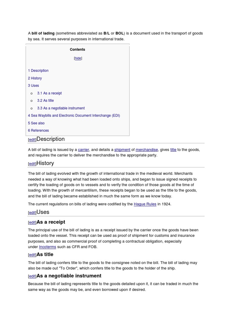 Although the term historically related only to carriage by sea, a bill of lading may today be used for any type of carriage of goods.